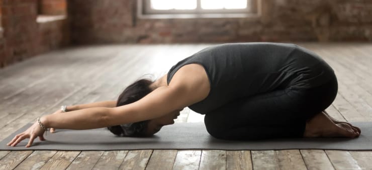 A genoux au sol, les fesses se posent vers les talons et le buste s’allonge sur les cuisses, bras étirés vers l’avant du tapis paumes de mains au sol. La tête peut reposer sur un tapis ou sur une brique. Maintenir la posture quelques minutes en respirant profondément.